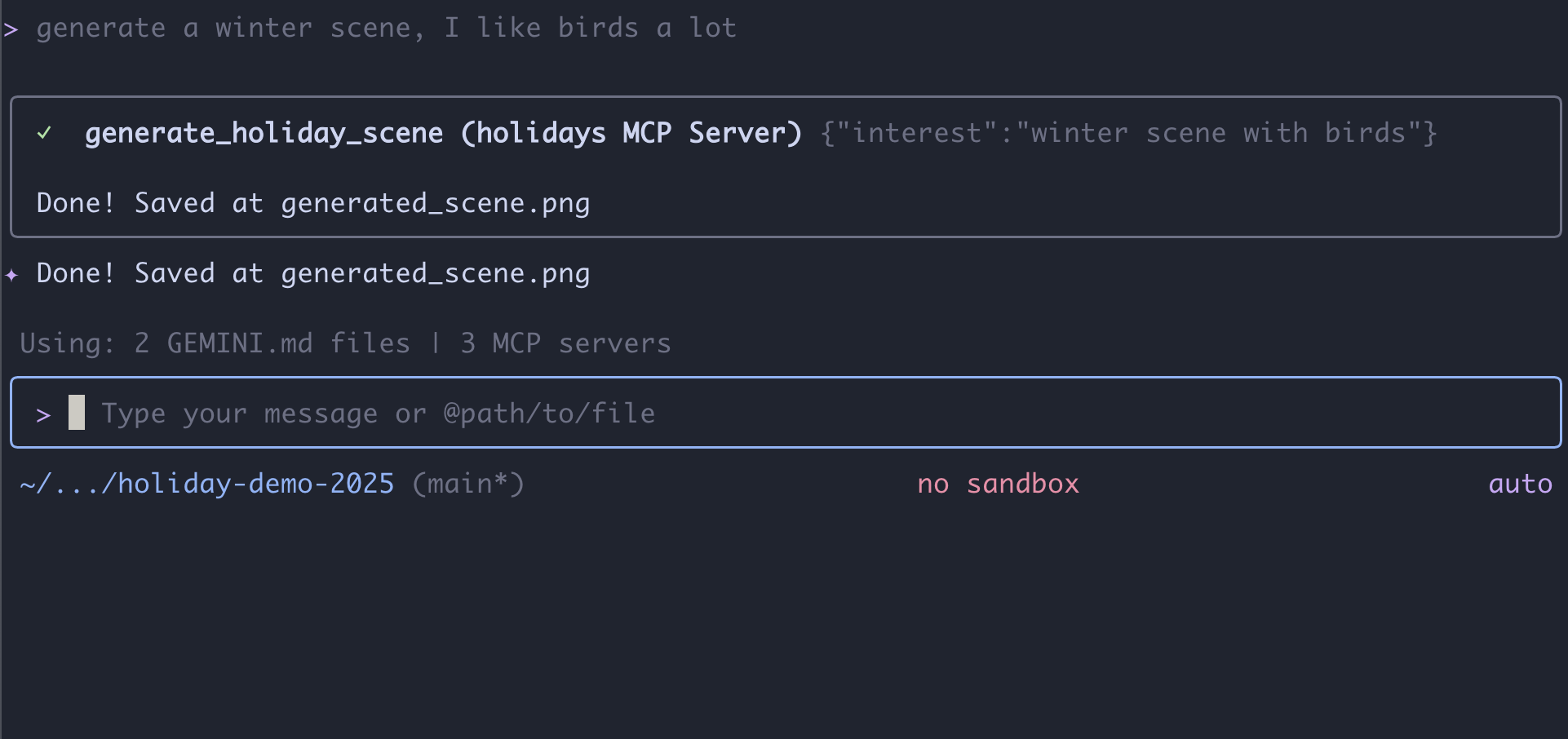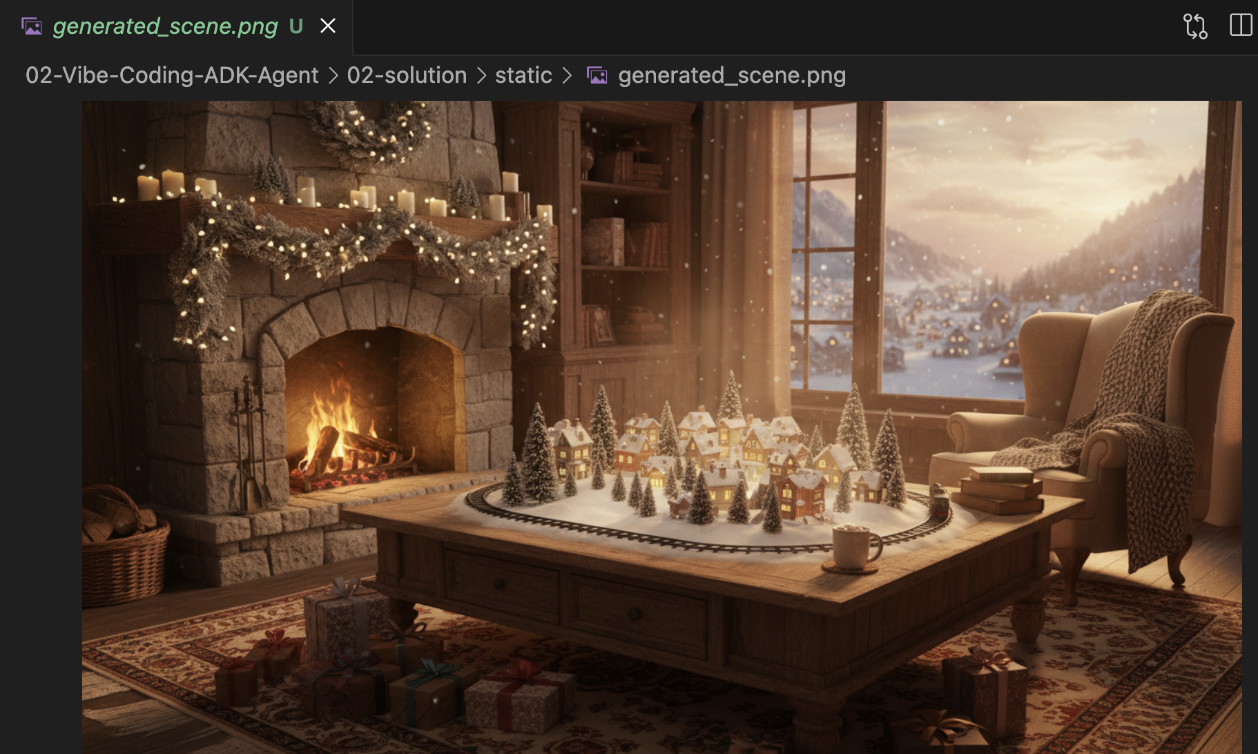 generate_holiday_scene. Notice how it automatically applies the "cute/cartoon" style defined in the system instructions).
