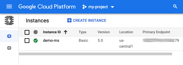 $ gcloud redis instances list --region us-central1 INSTANCE_NAME VERSION REGION TIER SIZE_GB HOST PORT NETWORK RESERVED_IP STATUS CREATE_TIME demo-ms REDIS_5_0 us-central1 BASIC 1 10.aa.bb.cc 6379 default 10.aa.bb.dd/29 READY 2022-01-28T09:24:45