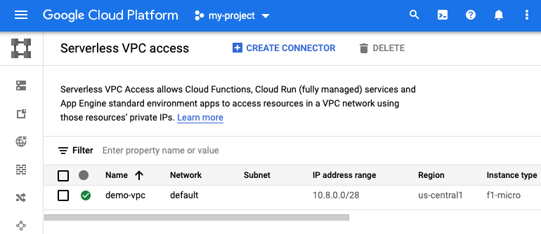$ gcloud redis instances delete demo-ms --region us-central1 You are about to delete instance [demo-ms] in [us-central1]. Any associated data will be lost. Do you want to continue (Y/n)? Delete request issued for: [demo-ms] Waiting for operation [projects/PROJECT/locations/REGION/operations/operation-aaaaa-bbbbb-ccccc-ddddd] to complete...done. Deleted instance [demo-ms]. $ $ gcloud compute networks vpc-access connectors delete demo-vpc --region us-central1 You are about to delete connector [demo-vpc] in [us-central1]. Any associated data will be lost. Do you want to continue (Y/n)? Delete request issued for: [demo-vpc] Waiting for operation [projects/PROJECT/locations/REGION/operations/aaaaa-bbbb-cccc-dddd-eeeee] to complete...done. Deleted connector [demo-vpc].