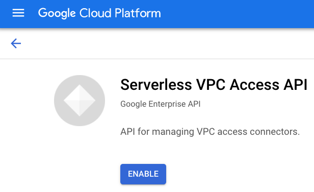 前往 Cloud Networking 的「Serverless VPC access」(無伺服器虛擬私有雲存取) 頁面頁面 (系統可能提示您提供帳單資訊)。如果您尚未啟用 API,系統會提示您啟用: