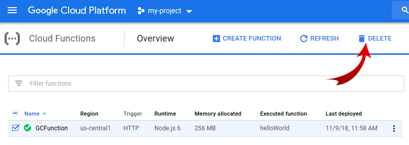 আপনি যদি ফাংশনটি মুছতে চান, কেবলমাত্র ওভারভিউ পৃষ্ঠায় যান, ফাংশনটি নির্বাচন করুন এবং মুছুন ক্লিক করুন: