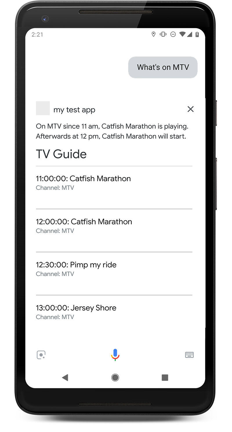 Creeremo un agente chatbot interattivo della guida TV per l'Assistente Google. Puoi chiedere alla guida TV quali contenuti vengono attualmente trasmessi su un determinato canale. Ad esempio: "Cosa c'è su MTV?" L'azione della Guida TV ti dirà cosa è in riproduzione al momento e cosa ci aspetta in futuro. |