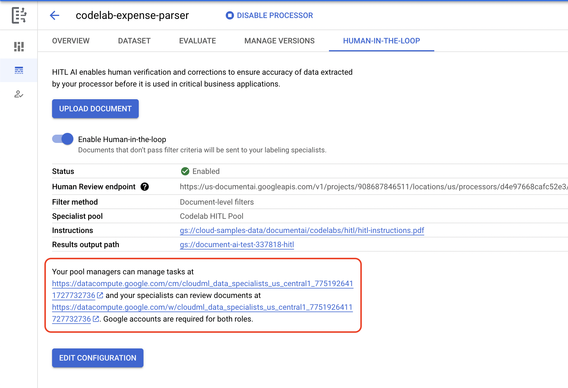 </ph> codelab-expense-parser아이콘을 클릭하여 프로세서의 사람의 검토 페이지를 엽니다.- Configure Human-In-The-Loop를 클릭합니다.
