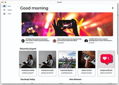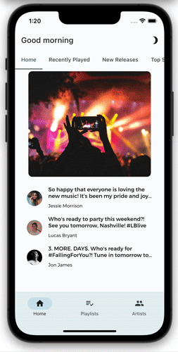 ¡Listo! Se debería ejecutar el código de partida para la pantalla principal de MyArtist. Deberías ver la pantalla principal de MyArtist. Se ve bien en las computadoras, pero en los dispositivos móviles… no se ve muy bien. Por ejemplo, no toma en consideración la muesca de la pantalla. No te preocupes, ya que corregirás este problema.