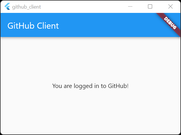 Compila un widget que contenga el flujo de OAuth2 para computadoras de escritorio. Se aplica una lógica razonablemente complicada, ya que debes ejecutar un servidor web temporal, redireccionar al usuario a un extremo en GitHub en su navegador web, esperar a que el usuario complete el flujo de autorización en su navegador y controlar una llamada de redireccionamiento de GitHub que incluye el código (que luego debe convertirse en un token de OAuth2 con una llamada diferente a los servidores de la API de GitHub).