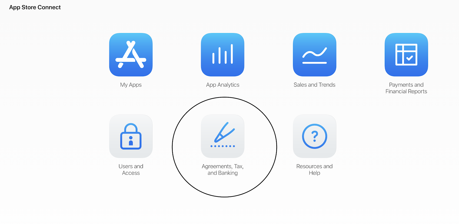 アプリ内購入を利用するには、App Store Connect で有料アプリの有効な契約も必要です。https://appstoreconnect.apple.com/ にアクセスし、[契約 / 税金 / 銀行口座情報] をクリックします。