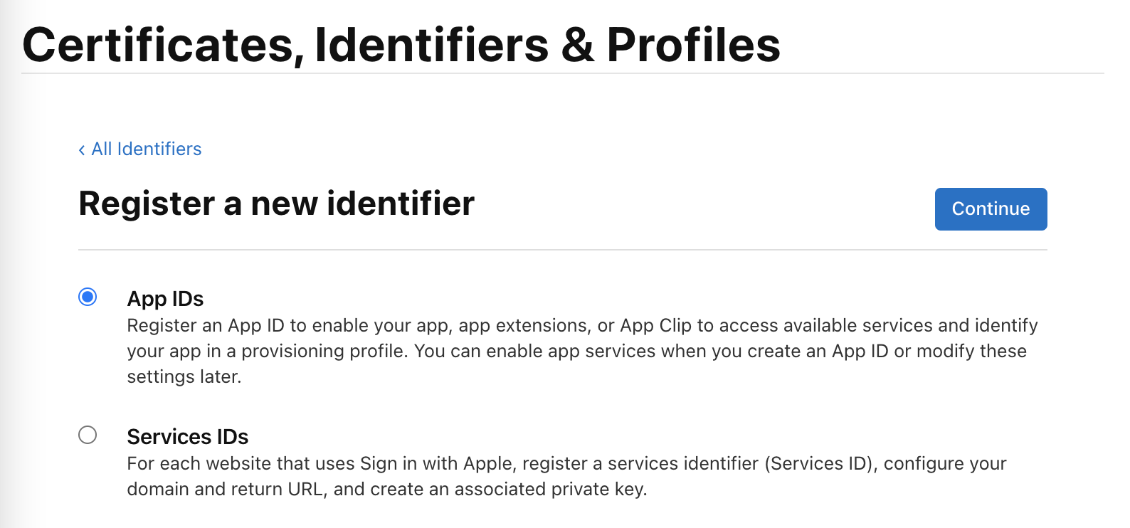Apple Developer Portal で新しい識別子を作成します。developer.apple.com/account/resources/identifiers/list にアクセスし、[Identifiers] ヘッダーの横にあるプラスアイコンをクリックします。