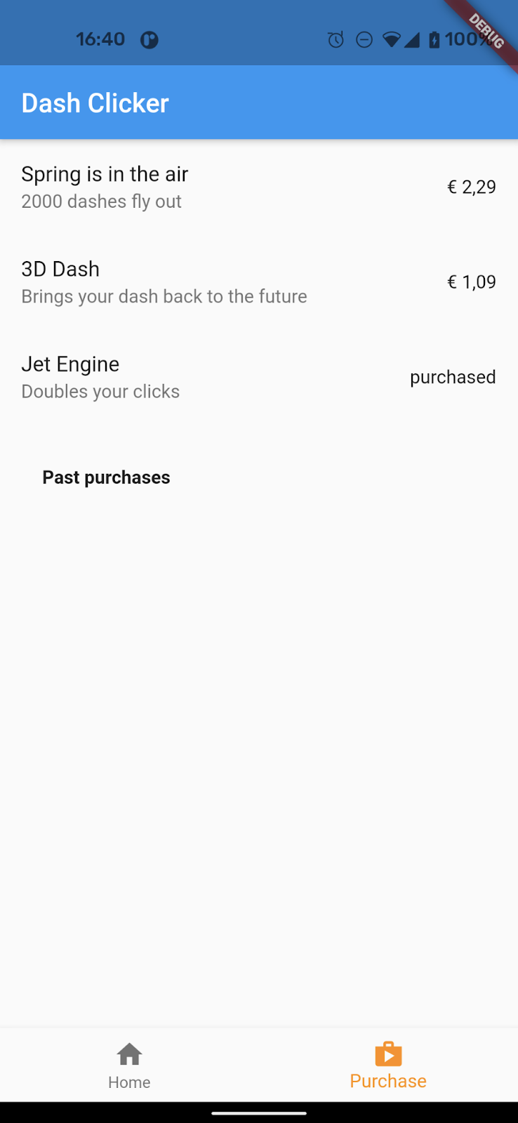 この Codelab では、アプリ(提供)に 3 種類のアプリ内購入を追加し、Firebase を使用した Dart バックエンドでこれらの購入を確認します。提供されたアプリ「Dash Clicker」には、Dash マスコットを通貨として使用するゲームが含まれています。次の購入オプションを追加します。