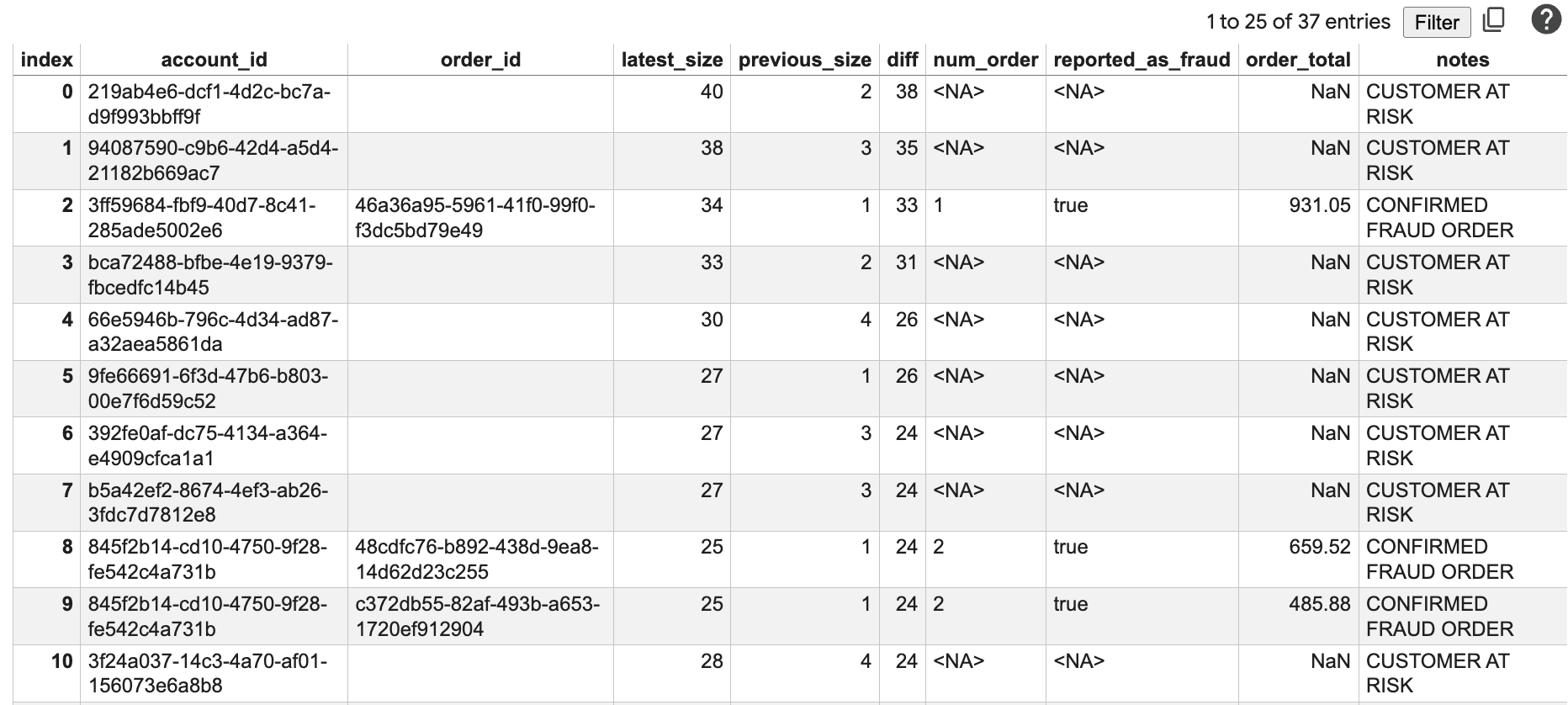 account_id: Die ID des Kontos, das analysiert wird.order_id: Eine aktuelle Bestell-ID.latest_size: Die Größe des verbundenen Netzwerks heute.previous_size: Die Größe des Netzwerks vor zwei Wochen.diff: Das Wachstum der Netzwerkgröße.num_order: Die Anzahl der letzten Bestellungen.reported_as_fraud: Gibt an, ob die Bestellung als Betrug gekennzeichnet wurde.order_total: Der Gesamtbetrag der Bestellung.notes: Ein berechneter Risikostatus basierend auf dem Netzwerkwachstum und dem Bestellverlauf.