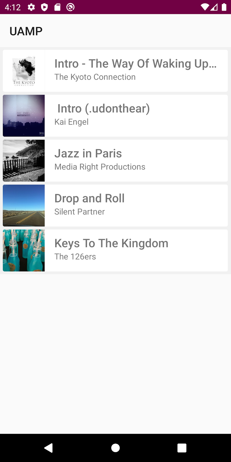 UAMP טוען קטלוג מוזיקה משרת מרוחק ומאפשר למשתמש לעיין באלבומים ובשירים. המשתמש מקיש על שיר והוא מושמע באוזניות או ברמקולים מחוברים. האפליקציה לא מיועדת לפעול עם תנועות מערכת. לכן, כשמריצים UAMP במכשיר עם Android מגרסה 10 ואילך, נתקלים בבעיות בהתחלה.