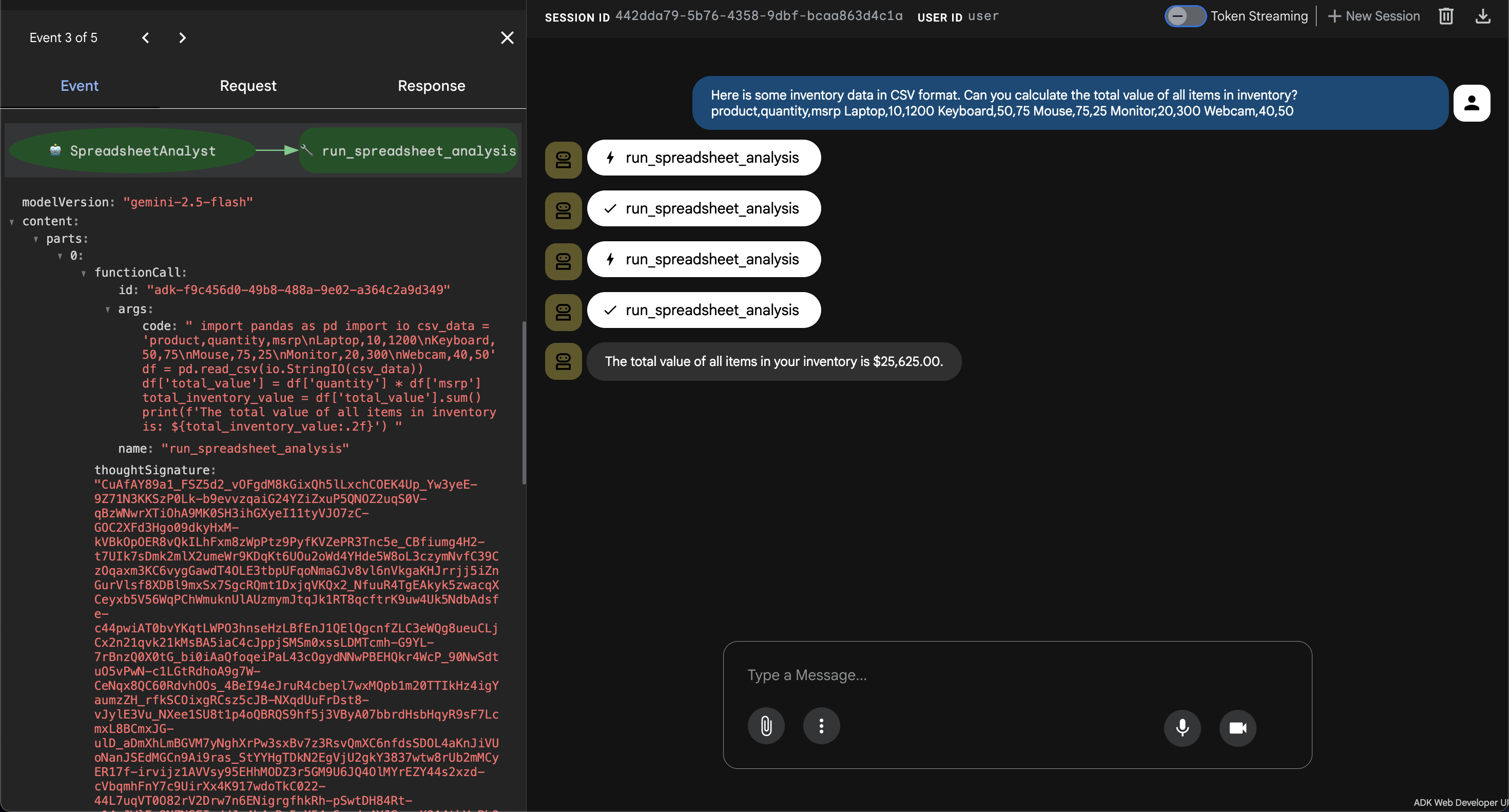 まず、エージェントのコアロジックを定義します。このエージェントは、ADK フレームワークを使用して、gemini-2.5-flash モデルを使用する SpreadsheetAnalyst という名前のエージェントを定義します。これには、GKE Agent Sandbox を呼び出して Python コードを安全に実行するツール(run_spreadsheet_analysis)が含まれています。エージェントの指示により、スプレッドシートの分析を求められたときに pandas ベースのコードを記述して実行します。