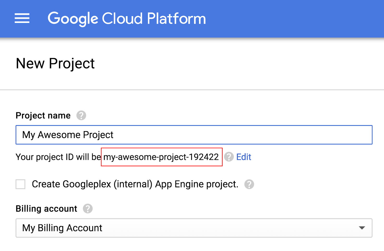 Ingresa un nombre de proyecto. Recuerda el ID del proyecto (destacado en rojo en la captura de pantalla anterior). El ID del proyecto debe ser un nombre único en todos los proyectos de Google Cloud. Si el nombre de tu proyecto no es único, Google Cloud generará un ID del proyecto aleatorio según el nombre del proyecto.