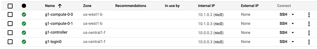 También puedes consultar la sección Instancias de VM en la consola de Google Cloud para ver los nodos aprovisionados recientemente. Tardará unos minutos en iniciar los nodos y ejecutar Slurm antes de que se asigne el trabajo a los nodos asignados recientemente. Tu lista de instancias de VM pronto se verá de la siguiente manera: