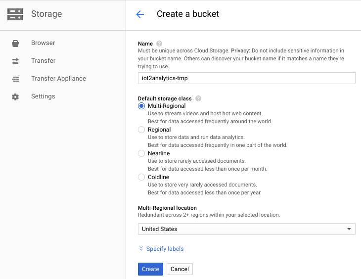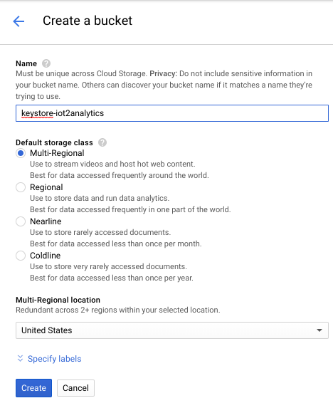 Elige un nombre para el bucket de almacenamiento (recuerda que debe ser un nombre que sea único a nivel global en todo Google Cloud) y haz clic en el botón Crear. Recuerda el nombre de este bucket de almacenamiento, ya que lo necesitarás pronto.