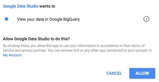 Haz clic en BigQuery, luego en el botón Autorizar y elige la Cuenta de Google que quieres usar con Data Studio (debe ser la misma que usaste para el codelab).