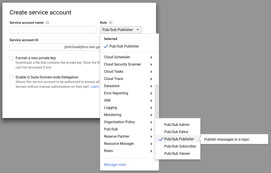 En el menú desplegable Función, selecciona el rol Publicador de Pub/Sub.