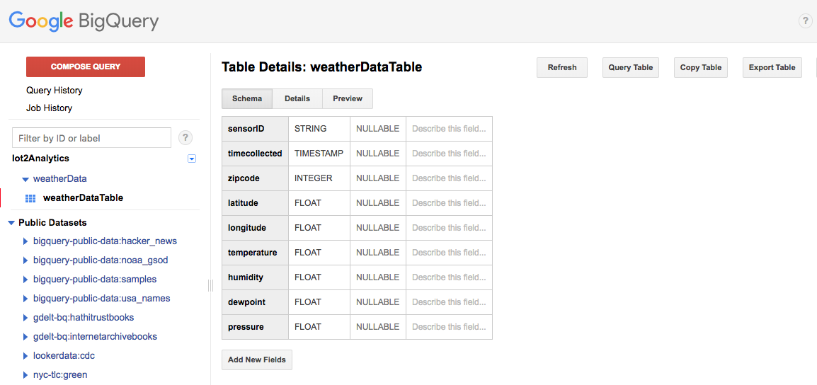 Debajo del nombre del proyecto (en el lado izquierdo de la ventana), haz clic en el conjunto de datos (weatherData), luego en la tabla (weatherDataTable) y luego en el botón Consultar tabla.