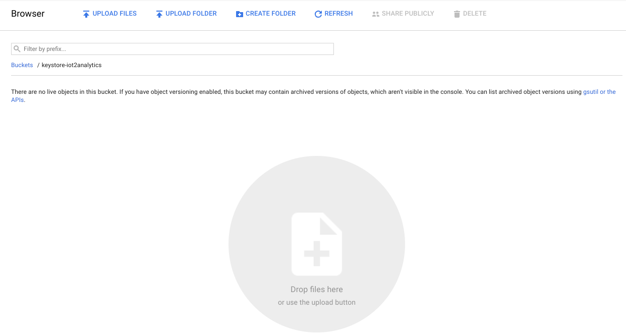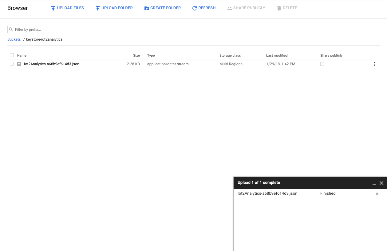 Una vez que se complete la carga de la clave, debería aparecer en el navegador de Cloud Storage.
