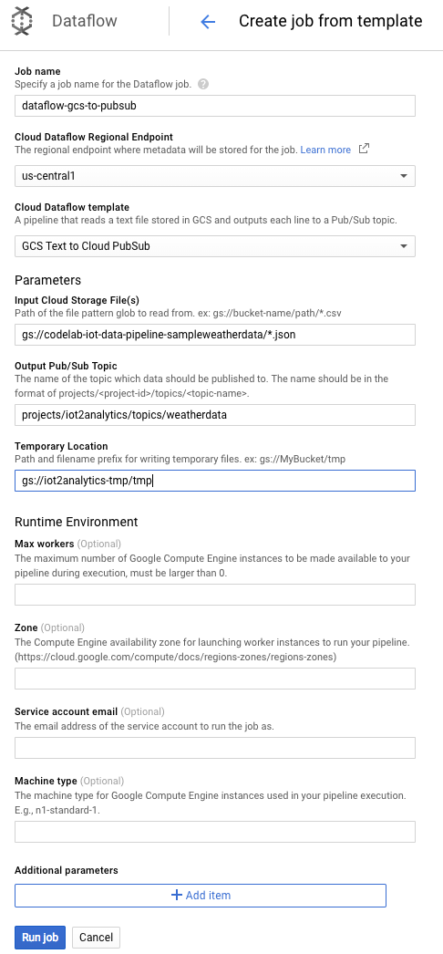 - Para los archivos de Cloud Storage de entrada, ingresa gs://codelab-iot-data-pipeline-sampleweatherdata/*.json (este es un conjunto de datos públicos).