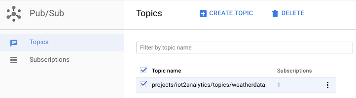 Ir a Pub/Sub, hacer clic en Tema, hacer clic en la casilla de verificación junto al tema weatherdata y, luego, en Borrar