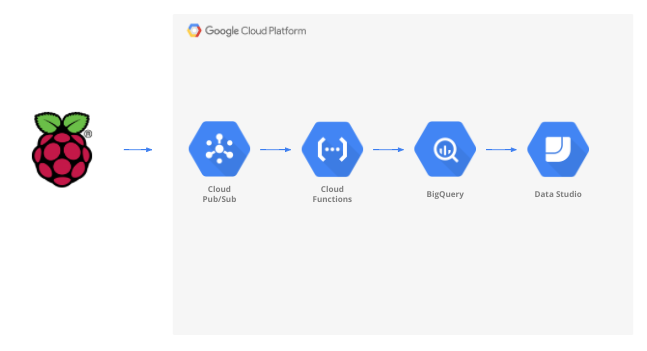 En este codelab, compilarás una canalización de datos meteorológicos que comienza con un dispositivo de Internet de las cosas (IoT), usa una cola de mensajes para recibir y entregar datos, aprovecha una función sin servidores para mover los datos a un almacén de datos y, luego, crea un panel que muestre la información. Se usará una Raspberry Pi con un sensor meteorológico para el dispositivo de IoT y varios componentes de Google Cloud Platform formarán la canalización de datos. Compilar Raspberry Pi, aunque es beneficioso, es una parte opcional de este codelab, y los datos meteorológicos de transmisión se pueden reemplazar por una secuencia de comandos.