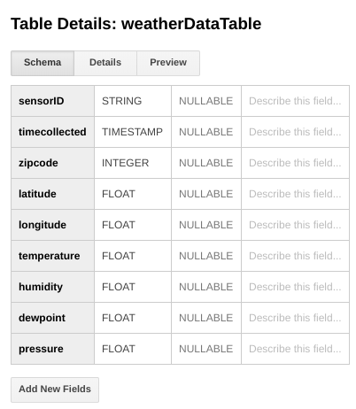 En Datos de origen, selecciona Crear tabla vacía. En Nombre de la tabla de destino, ingresa weatherDataTable. En Esquema, haz clic en el botón Agregar campo hasta que haya un total de 9 campos. Completa los campos como se muestra a continuación y asegúrate de seleccionar también el Tipo adecuado para cada campo. Cuando todo esté completo, haz clic en el botón Crear tabla.