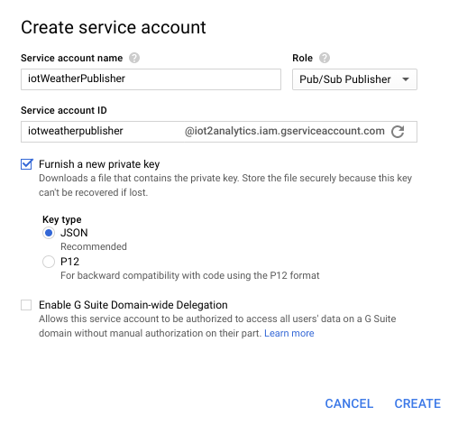 Escribe un nombre de cuenta de servicio (iotWeatherPublisher), marca la casilla de verificación Proporcionar una clave privada nueva, asegúrate de que el tipo de clave esté configurado en JSON y haz clic en "Create".
