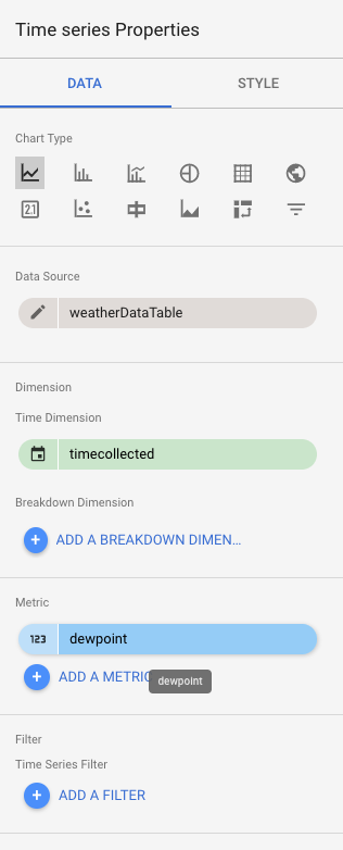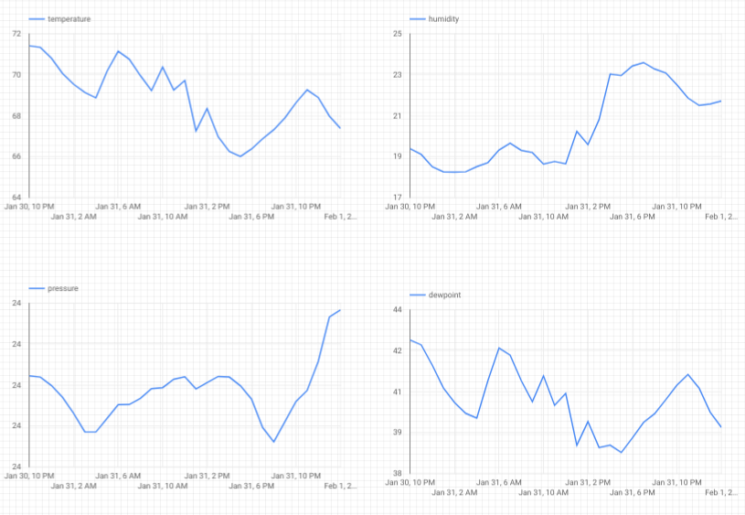 Haz clic en cada gráfico y, en la sección Datos y propiedades de serie temporal, haz clic en la métrica existente (punto de rocío) y elige una métrica diferente para que se muestre hasta que las cuatro lecturas meteorológicas (punto de rocío, temperatura, humedad y presión) tengan su propio gráfico.