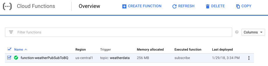 Ve a Cloud Functions, haz clic en la casilla de verificación junto a function-weatherPubSubToBQ y, luego, en Borrar.