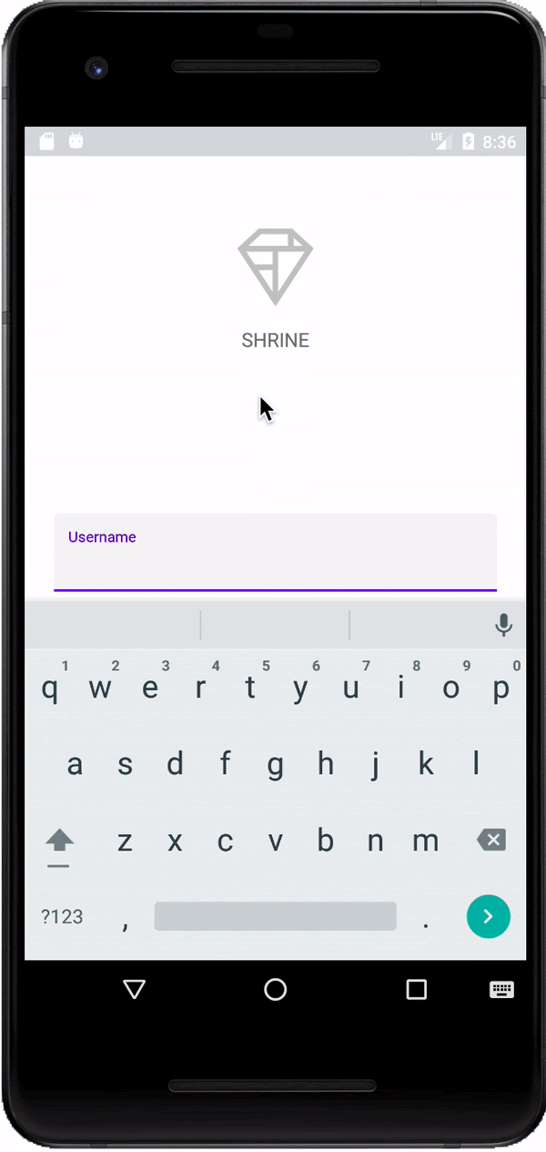 在 shr_login_fragment.xml 中,在「SHRINE」下方的 <LinearLayout> 內新增兩個 TextInputLayout 元素,其中包含子項 TextInputEditText標籤 <TextView>: