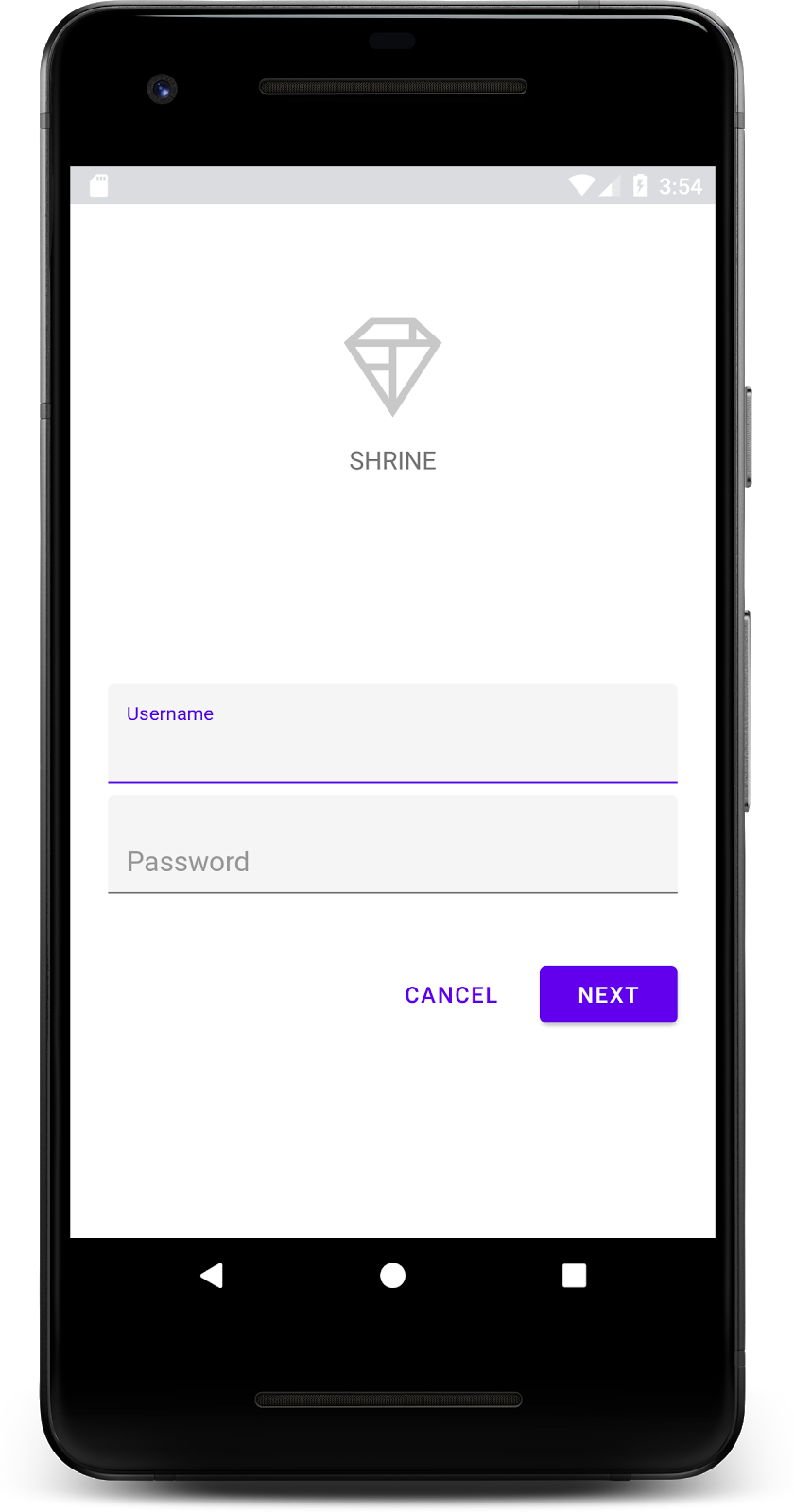 shr_login_fragment.xml এ, "SHRINE" লেবেলের নিচে <LinearLayout> এর ভিতরে একটি চাইল্ড TextInputEditText সহ দুটি TextInputLayout উপাদান যোগ করুন <TextView> :