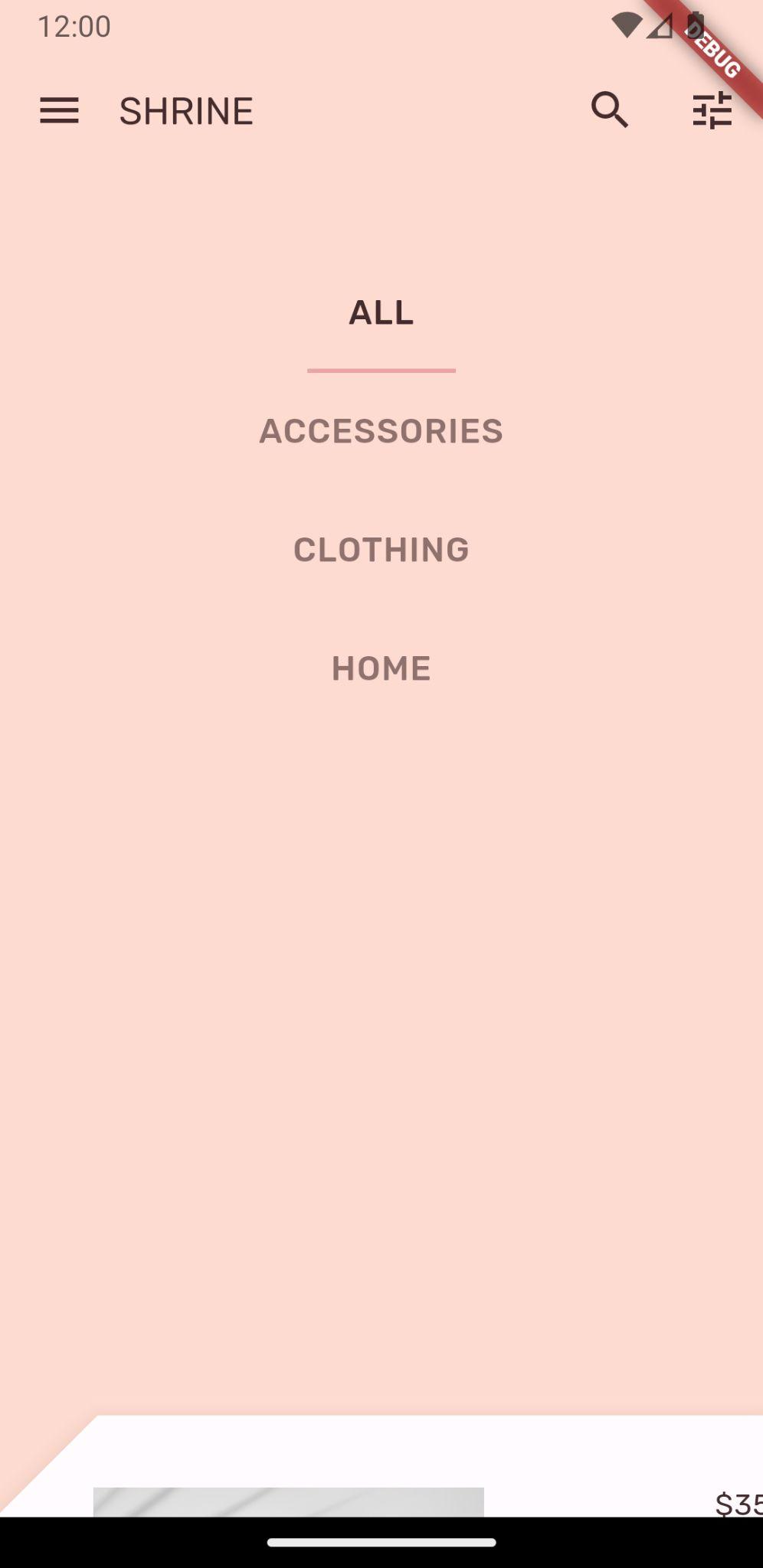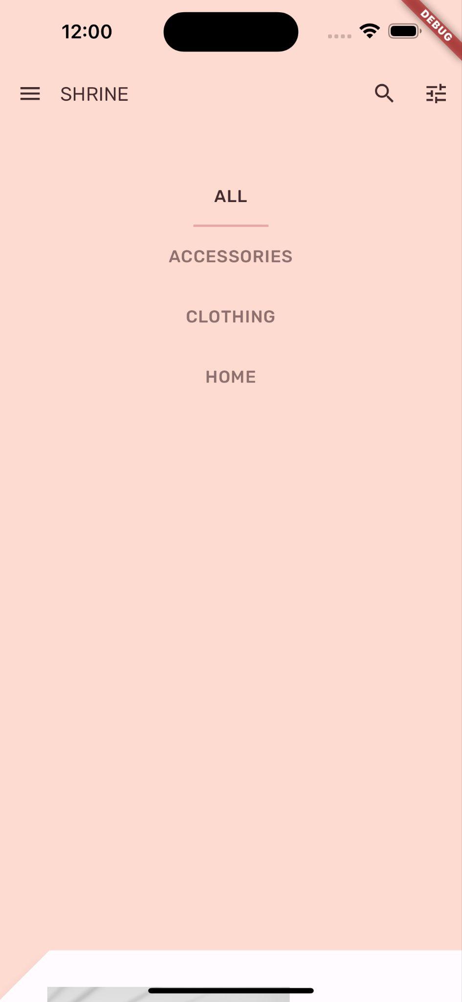 在本程式碼研究室中,您會將 Shrine 應用程式中的 UI 變更為「背景幕」的雙層簡報。背景幕提供的選單列出了可選取的類別,可用來篩選非對稱式格線中顯示的產品。在本程式碼研究室中,您將使用下列資料: