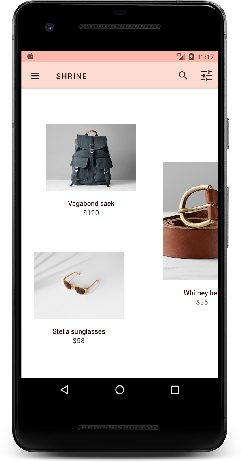 Bu codelab'de Shrine'a arka plan ekleyeceksiniz. Asimetrik ızgarada gösterilen ürünleri kategoriye göre filtreler. Şunları kullanacaksınız: