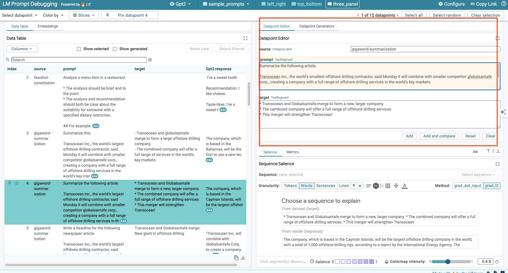 您可以使用 LIT 並排比較原始和編輯後的提示。您可以手動編輯範例,並同時查看原始版本的預測結果和序列顯著性分析。您可以修改每個資料點的提示,LIT 會透過查詢模型產生對應的回應。