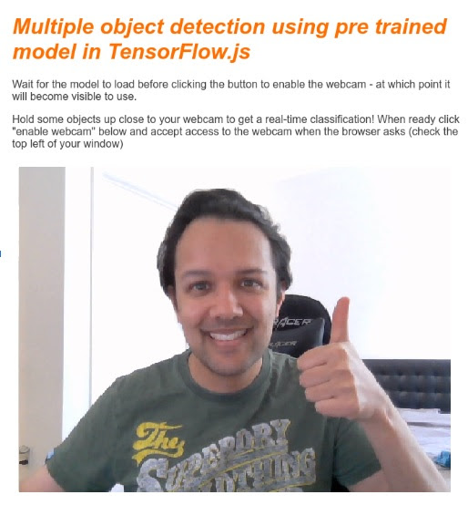 - 创建一个网页,直接在网络浏览器中通过 TensorFlow.js 使用机器学习技术,对实时摄像头直播中的常见对象进行分类和检测(是的,包括一次多个对象)。