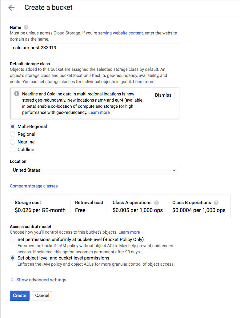 Pressione "Criar" Quando estiver tudo pronto, anote o nome do bucket do Cloud Storage para as etapas posteriores. |