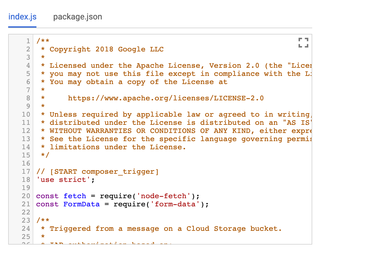 Clique na guia index.js, copie e cole o código na seção index.js do editor in-line do Cloud Functions |