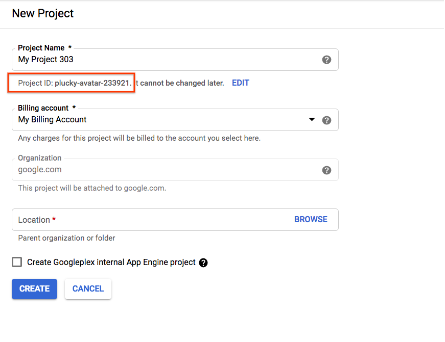 Se você estiver criando um novo projeto, o ID dele pode ser encontrado logo abaixo do nome do projeto na página de criação. |