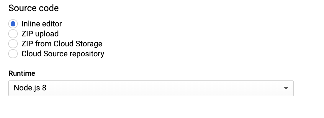 Deixe o código-fonte definido como "Editor in-line" e definir o ambiente de execução como "Node.js 8" |