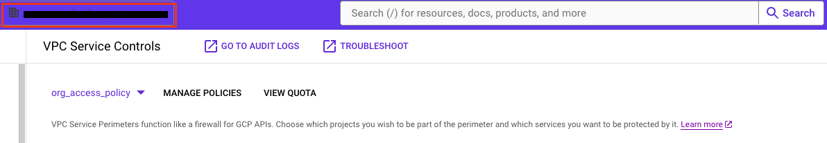 - في Google Console، اختَر مؤسستك و الوصول إلى عناصر التحكّم في خدمة سحابة VPC. يُرجى التأكّد من أنّك على مستوى المؤسسة.