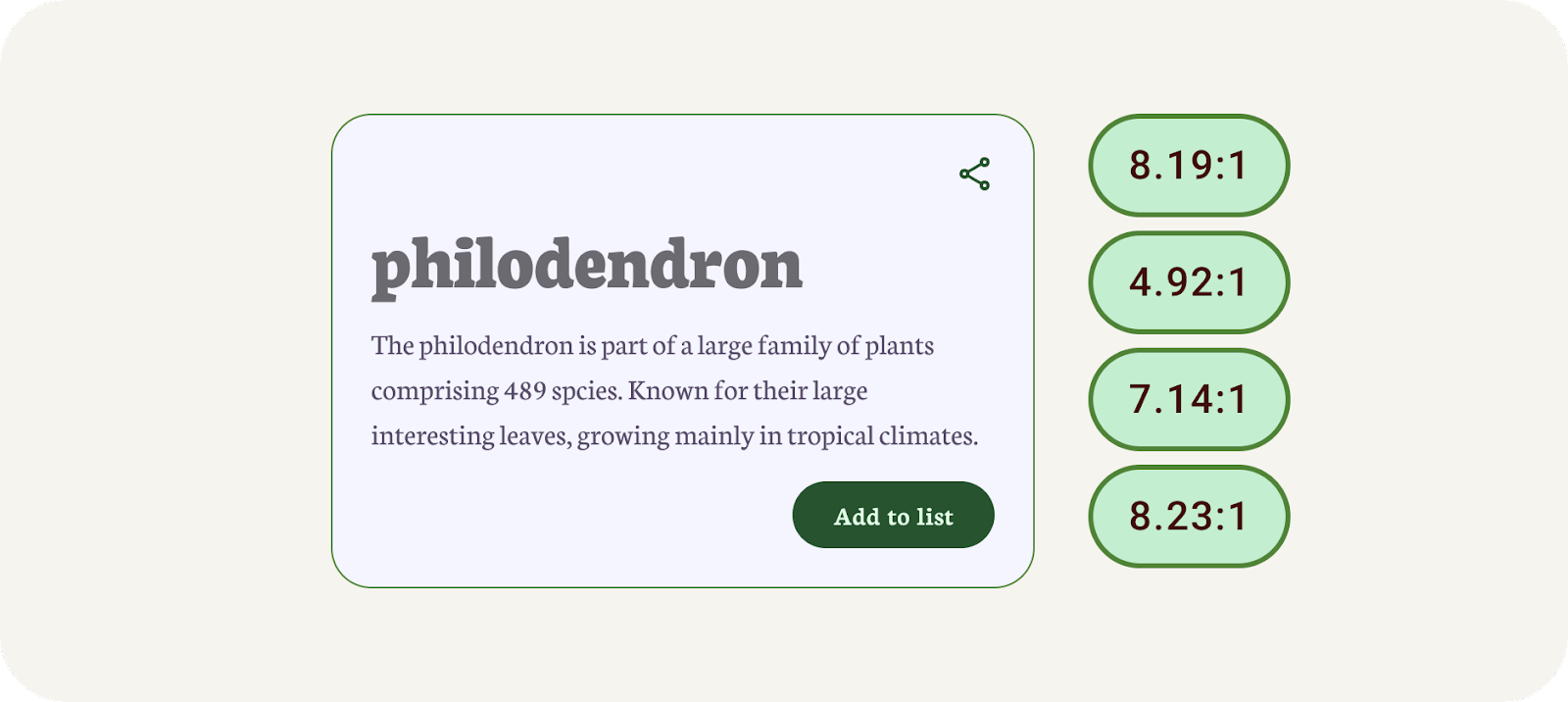 คอนทราสต์ของสีคือความแตกต่างระหว่างความสว่างขององค์ประกอบพื้นหน้าและพื้นหลังซึ่งแสดงในรูปแบบอัตราส่วน เกณฑ์อัตราส่วนนี้เป็นคะแนน การวัดความแตกต่างระหว่างคำพูด ข้อความบนปุ่มกับที่เก็บของปุ่ม สามารถช่วยตัดสินได้ว่าข้อความจะอ่านได้ชัดเจนหรือไม่