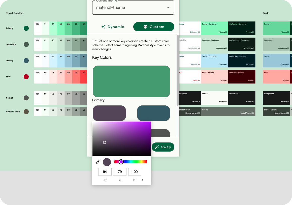 - ในโมดัลปลั๊กอิน ให้คลิกกำหนดเอง การดำเนินการนี้จะเปลี่ยนธีมเป็นธีมที่กำหนดเอง ธีมวัสดุสร้างขึ้นแล้ว แต่คุณสร้างธีมใหม่ได้หากต้องการ ดูข้อมูลเพิ่มเติมได้ที่การแสดงภาพไดนามิกสี