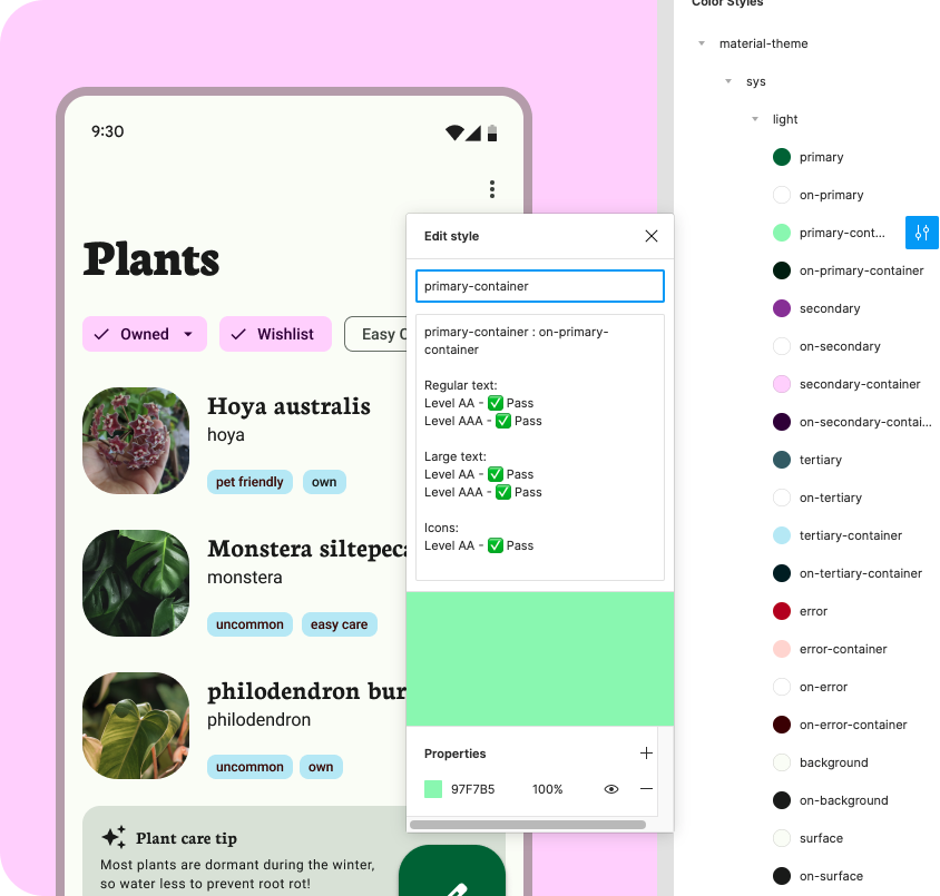 เครื่องมือสร้างธีมจะสร้างโทเค็นดีไซน์ Material เป็นรูปแบบ Figma ซึ่งช่วยให้คุณเห็นภาพของสีแบบไดนามิกและสร้างธีมที่กำหนดเอง ซึ่งทำได้ในขณะทำตามระบบสี Material 3 เพื่อสร้างสีที่เข้าถึงได้ในรูปแบบสี