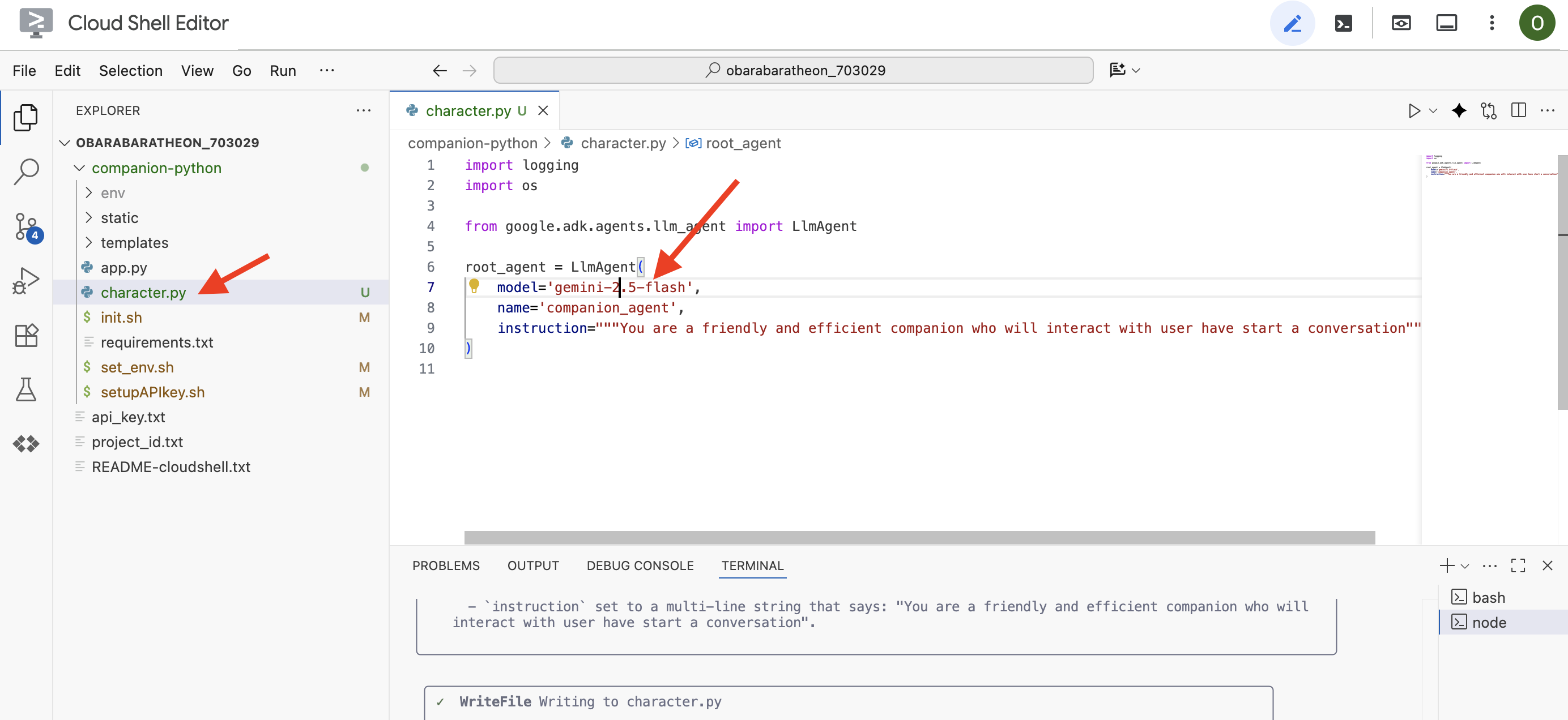 👉 استخدِم "المحرّر" وانتقِل إلى character.py ضمن المجلد companion-python. يُرجى التحقّق من السطر model= وتعديله يدويًا إلى gemini-2.5-flash إذا تم اختيار نموذج مختلف. سيضمن ذلك الاتساق في بقية ورشة العمل.