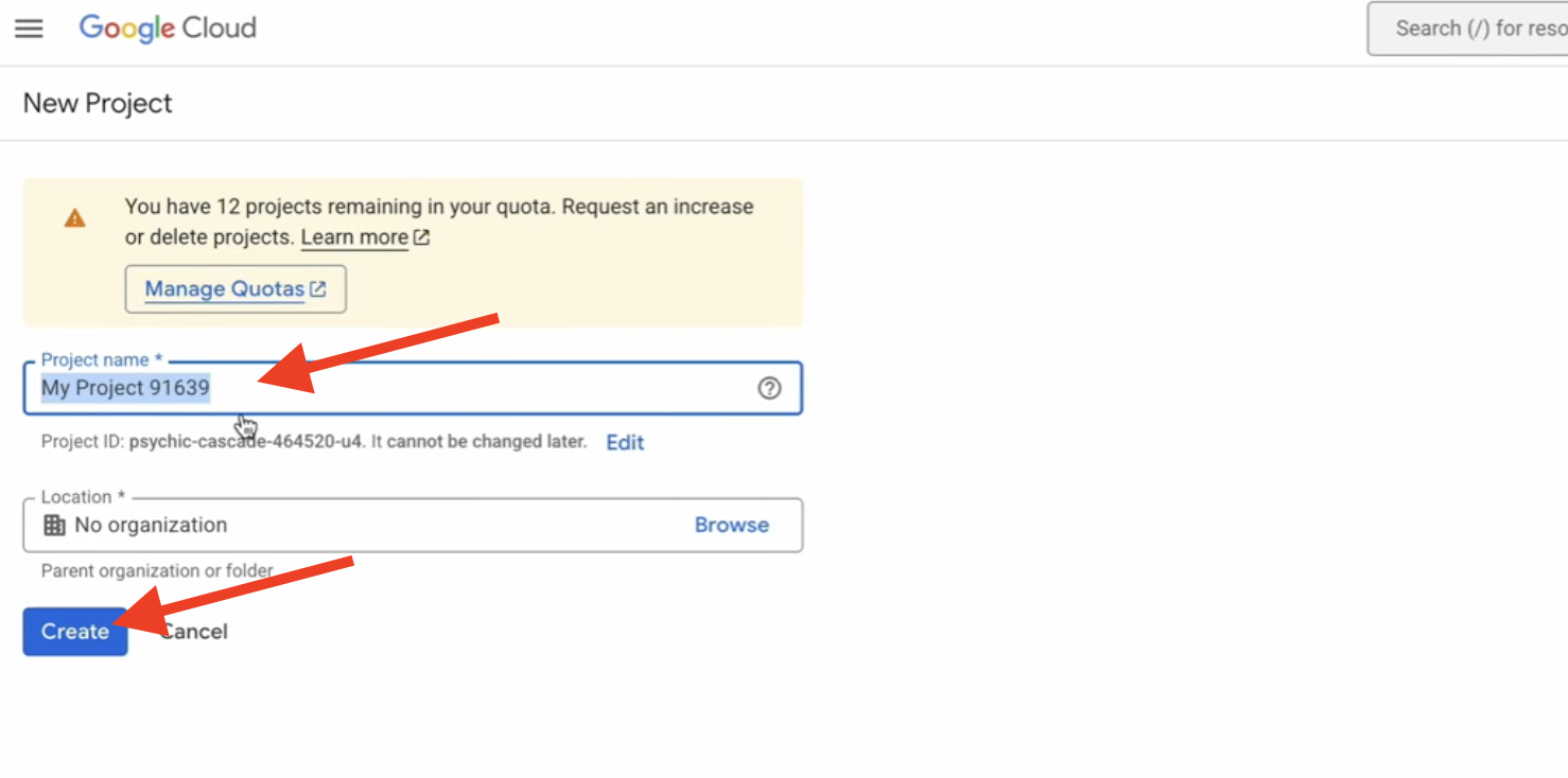 👉 プロジェクトに名前を付けて、[作成] をクリックします。(組織なし)