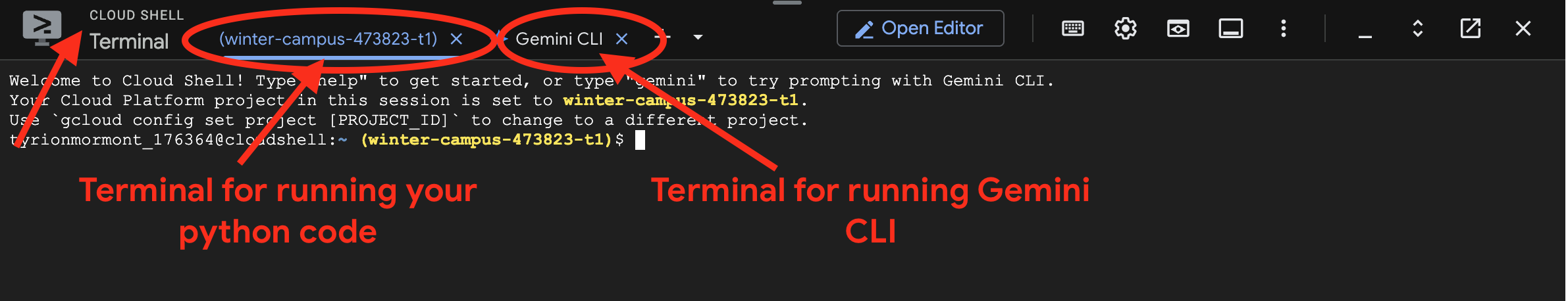 👉💻 서버를 실행하지 않는 Gemini CLI 터미널로 돌아가 Gemini 대화형 셸을 시작합니다. 이미 실행 중인 경우 CTRL+C를 두 번 눌러 종료하고 다시 시작하여 새 설정을 로드합니다.