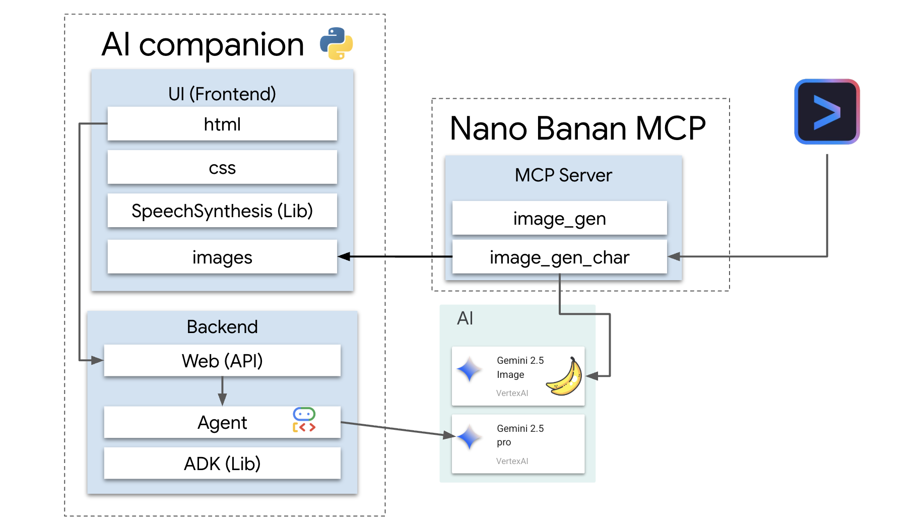 除此之外,我们还将通过启动本地 MCP(Model Context Protocol)服务器来探索更高级的概念。此服务器充当图片生成的专用工具桥梁。然后,我们将使用 Gemini CLI 命令此 MCP 服务器,指示其为我们的 AI 伴侣生成独特的外观。