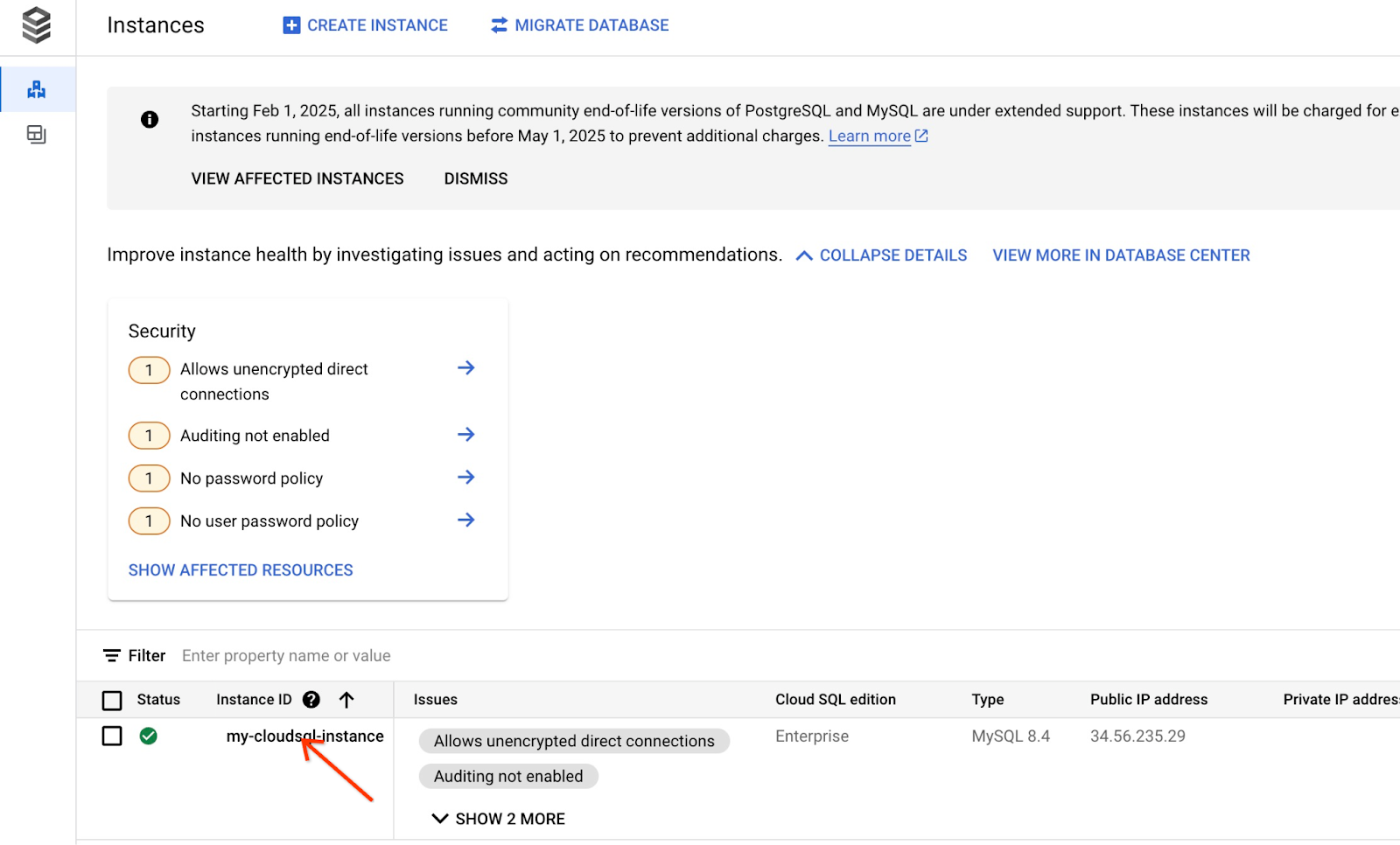 $gcloud sql connect my-cloudsql-instance --user=root Allowlisting your IP for incoming connection for 5 minutes...done. Connecting to database with SQL user [root].Enter password: Welcome to the MySQL monitor. Commands end with ; or \g. Your MySQL connection id is 71 Server version: 8.4.4-google (Google) Copyright (c) 2000, 2025, Oracle and/or its affiliates. Oracle is a registered trademark of Oracle Corporation and/or its affiliates. Other names may be trademarks of their respective owners. Type 'help;' or '\h' for help. Type '\c' to clear the current input statement. mysql>