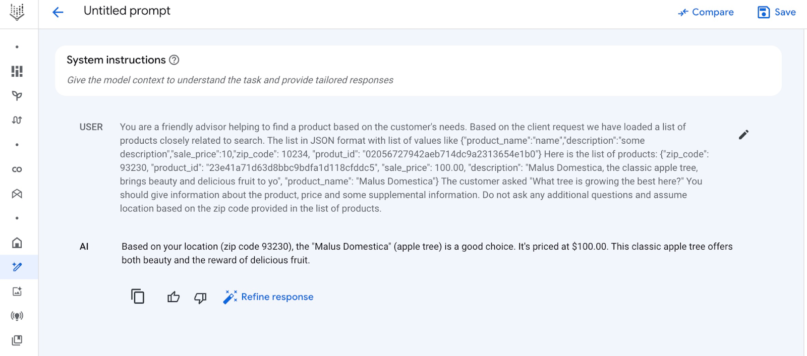 Nous pouvons utiliser le fichier JSON généré pour l'inclure dans la requête du modèle de texte d'IA générative dans Vertex AI Studio.