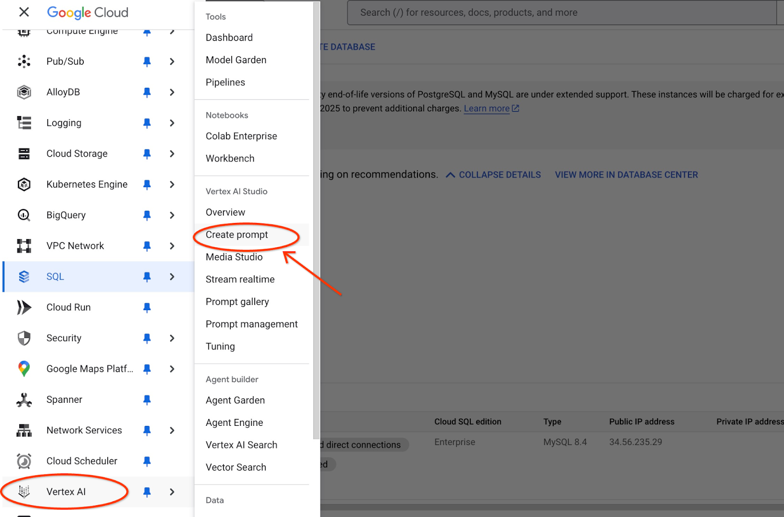 Cloud SQL, Compute Engine, ağ hizmetleri ve Vertex AI'ı kullanmak için Google Cloud projenizde ilgili API'leri etkinleştirmeniz gerekir.